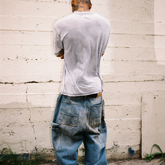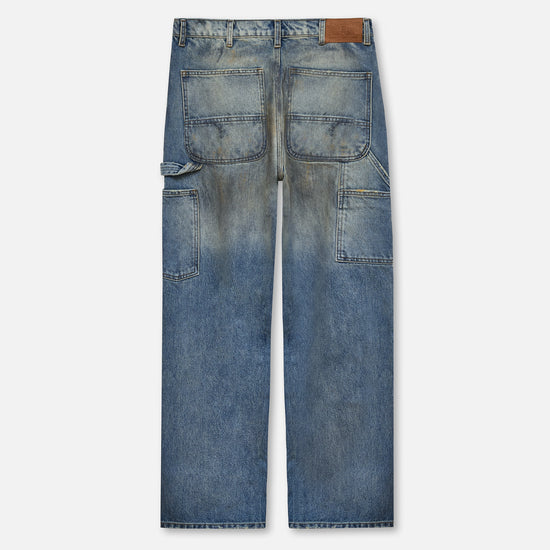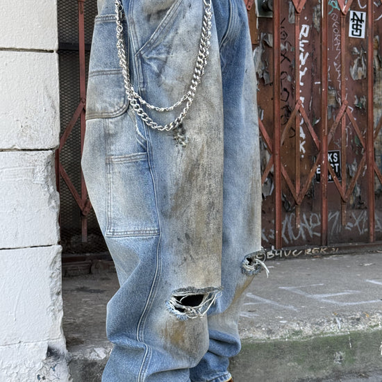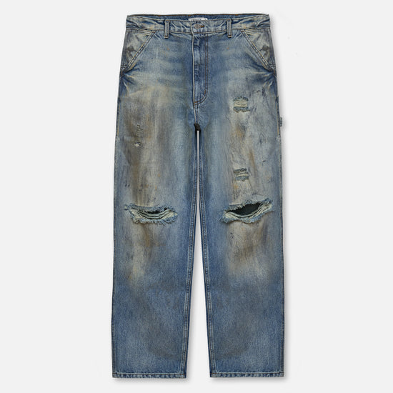These distressed jeans are cut from mid blue denim in a baggy fit, with a mid-rise waist, ultra wide leg, and extra long length for that perfect stack. Finished with a mud wash and distressing for a worn-in, lived-through look.