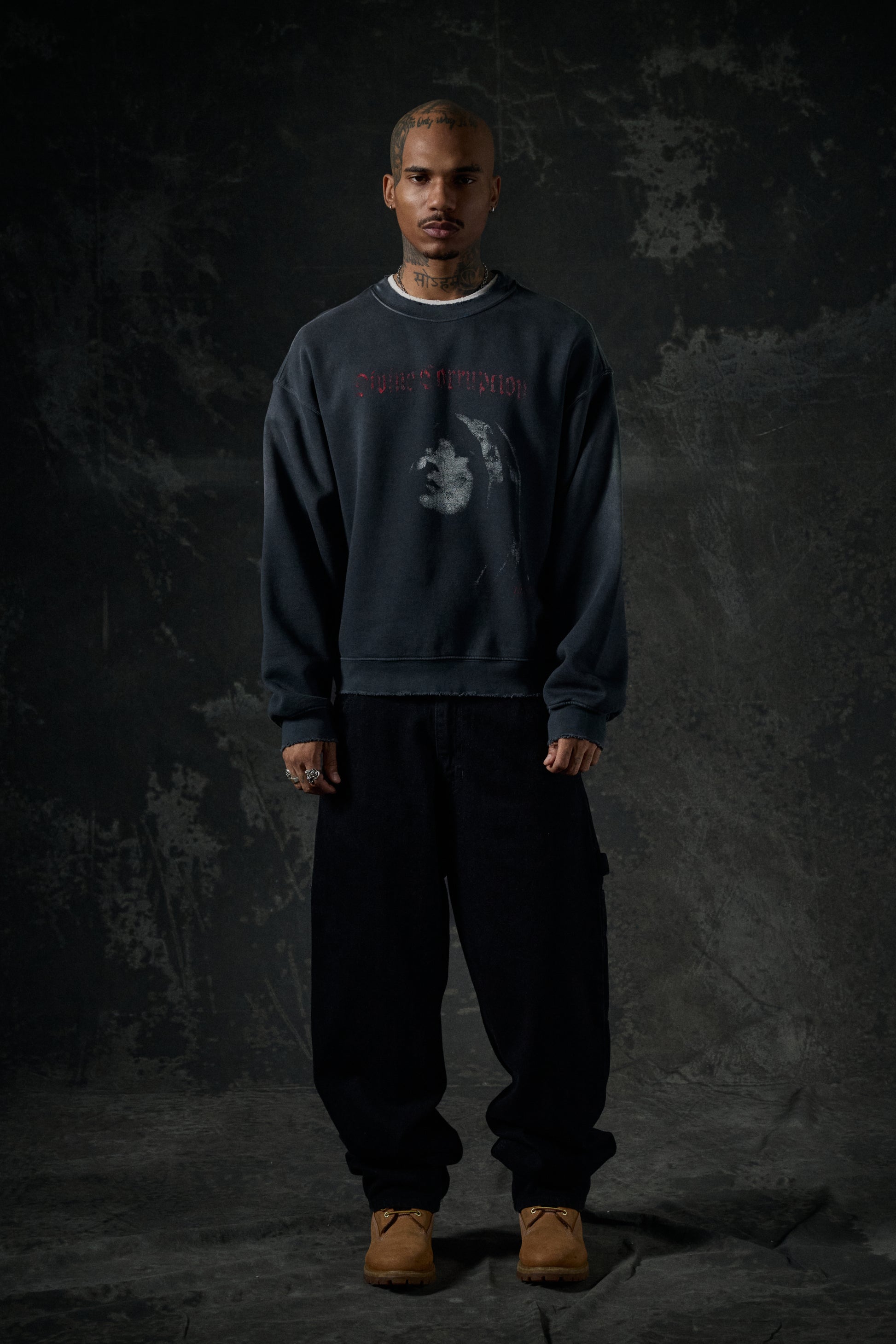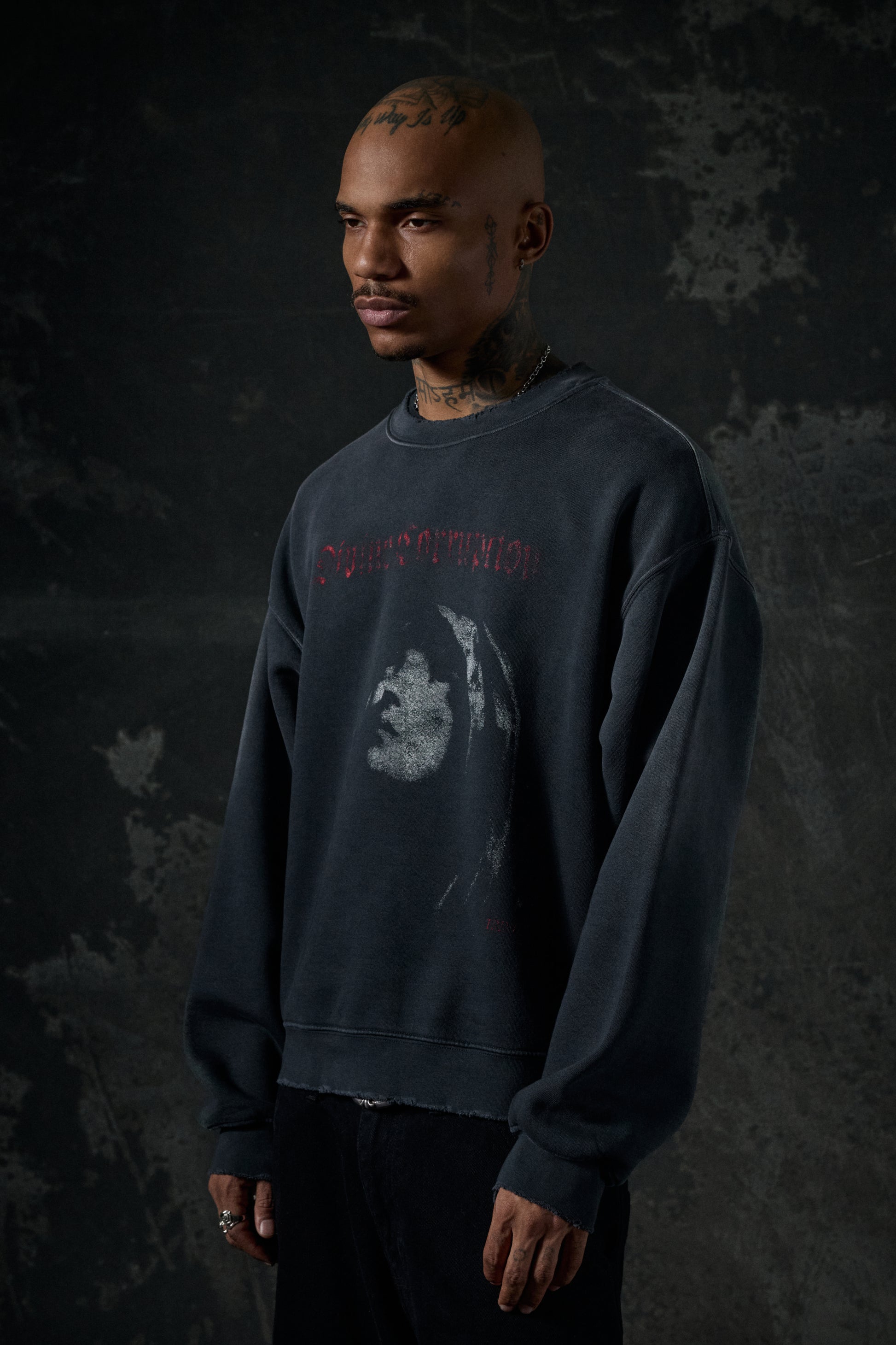 The perfect balance of edge and lived-in comfort. This crewneck is crafted from 450 GSM Cotton Fleece for a structured yet broken-in feel. Designed with a relaxed fit that drapes effortlessly, it’s made for layering or standout solo wear.