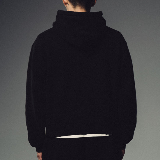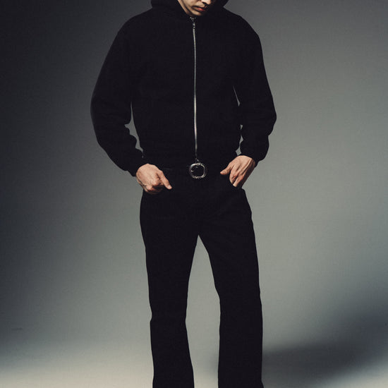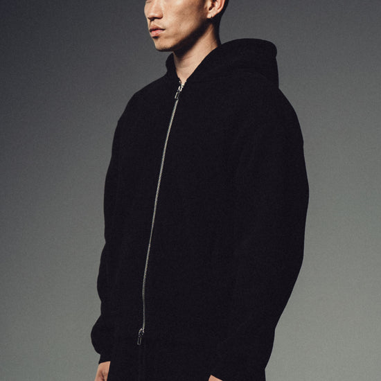 A refined essential built for everyday wear. This black zip hoodie is crafted from 450 GSM 100% cotton fleece, offering a structured feel that breaks in over time without losing its shape.