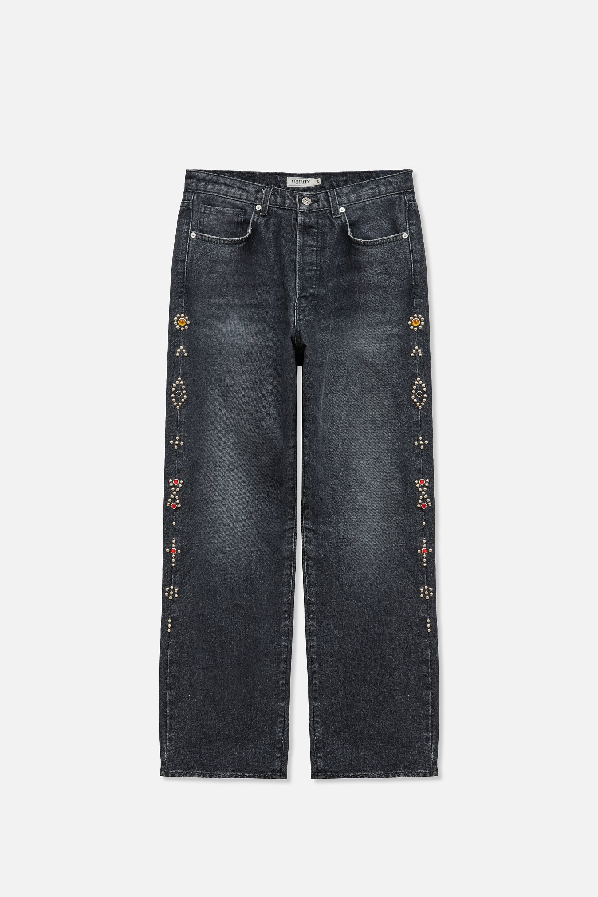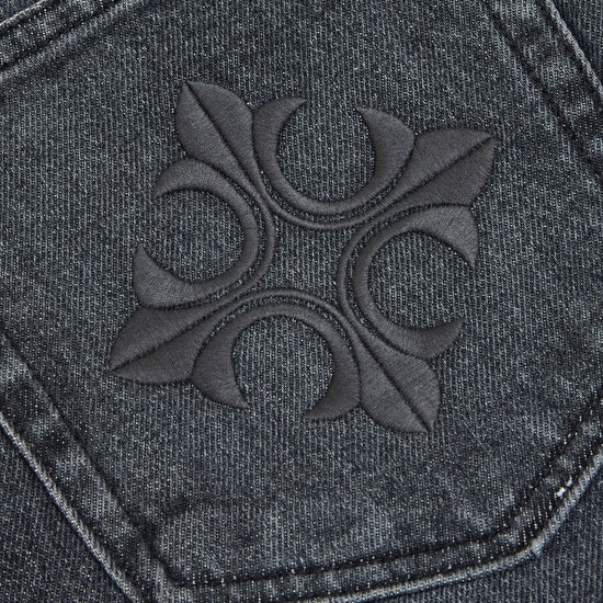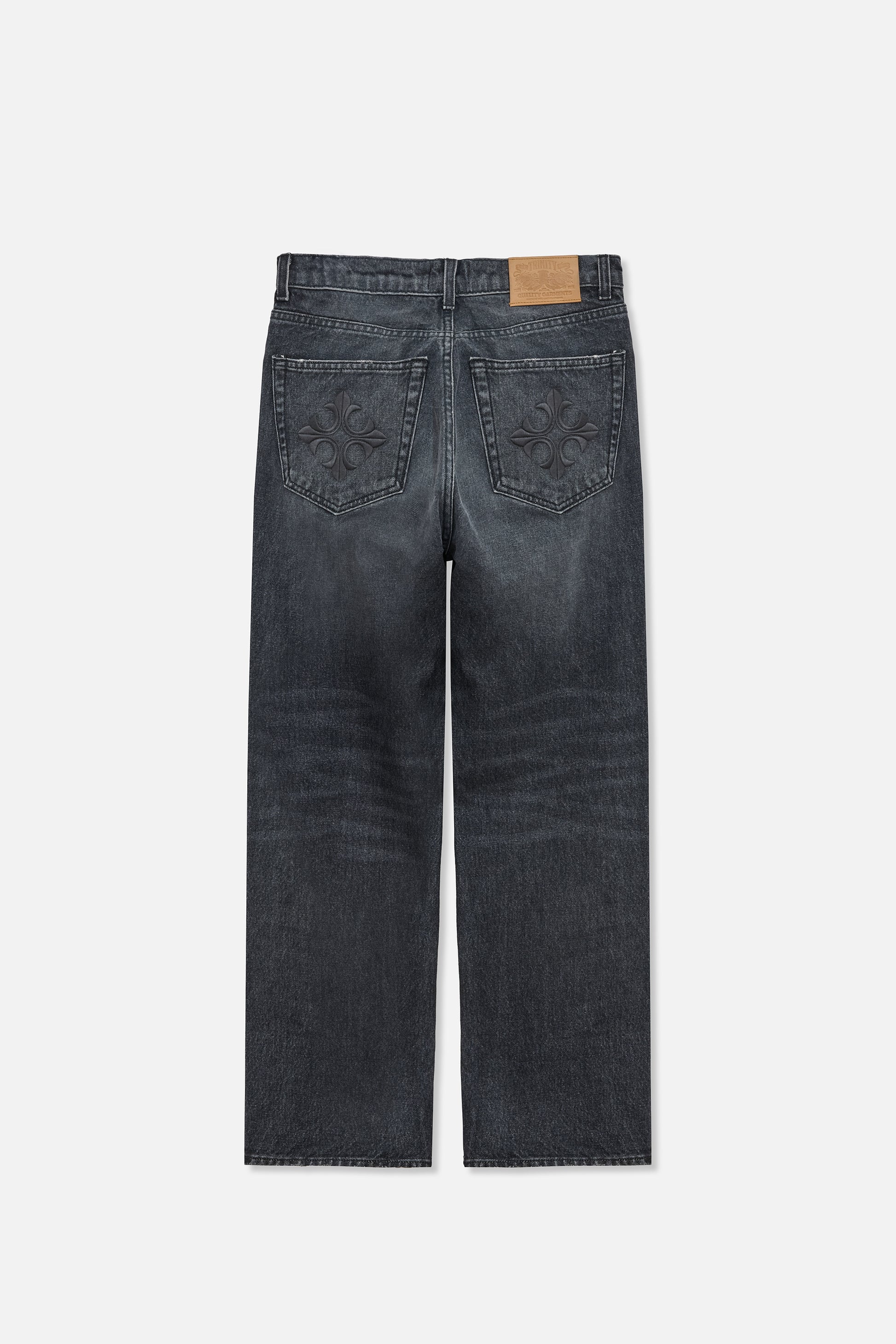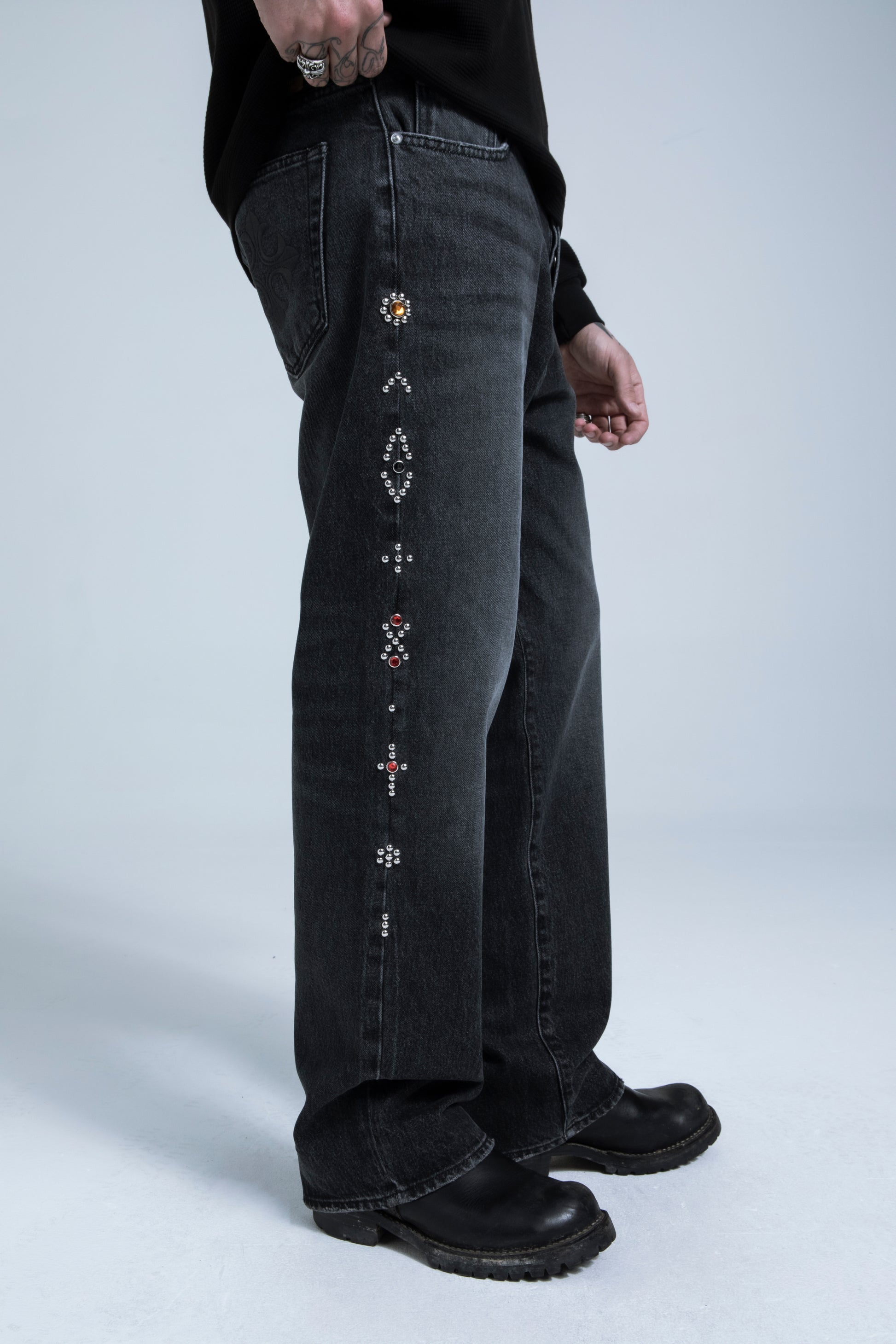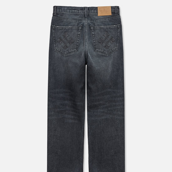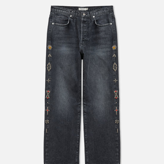 A statement take on a classic silhouette. These straight leg jeans are crafted from premium denim with a soft, worn-in wash that offers comfort while holding structure through wear. Cut with a slightly wider straight leg, they’re finished with metal hardware detailing along the outer seams for added edge and dimension.