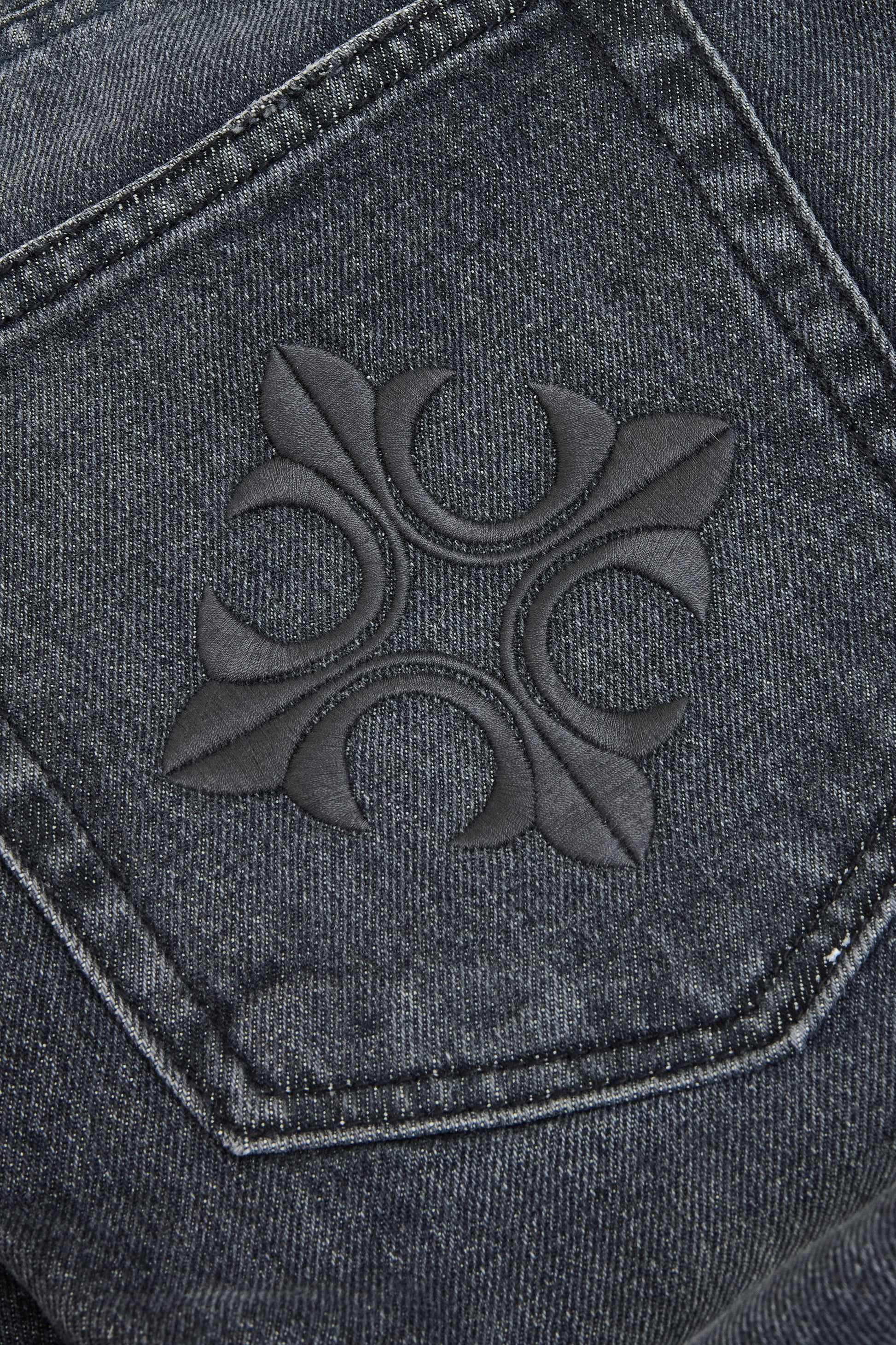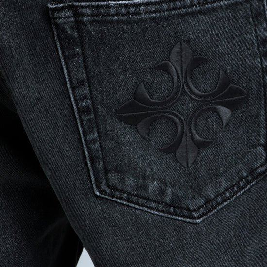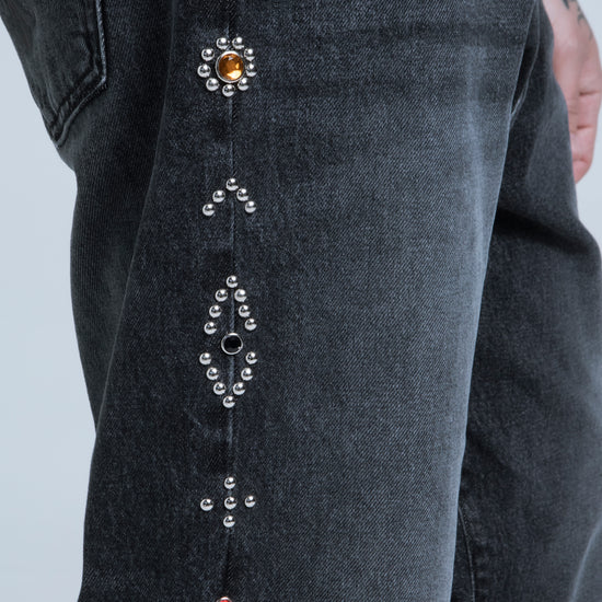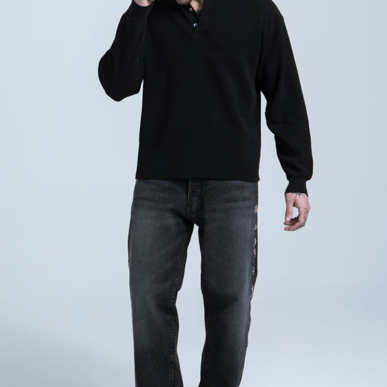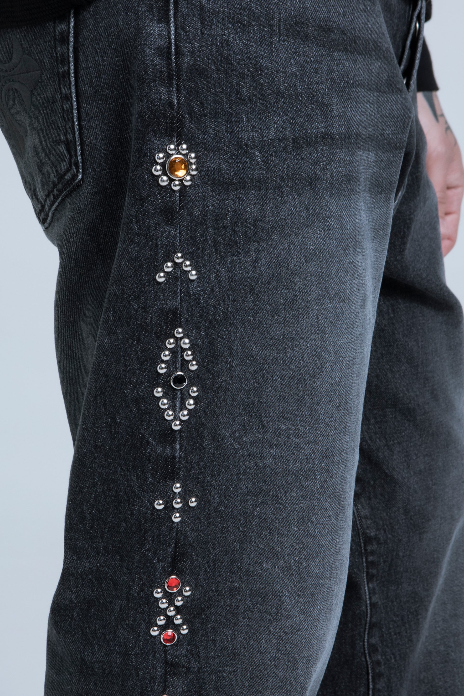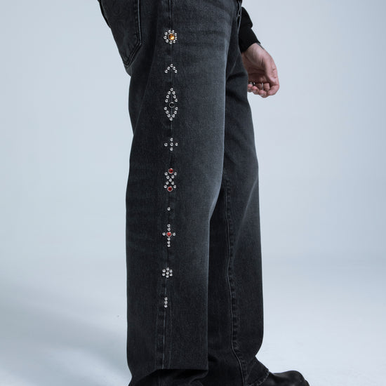 A statement take on a classic silhouette. These straight leg jeans are crafted from premium denim with a soft, worn-in wash that offers comfort while holding structure through wear. Cut with a slightly wider straight leg, they’re finished with metal hardware detailing along the outer seams for added edge and dimension.
